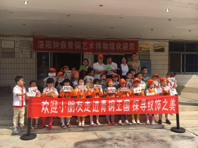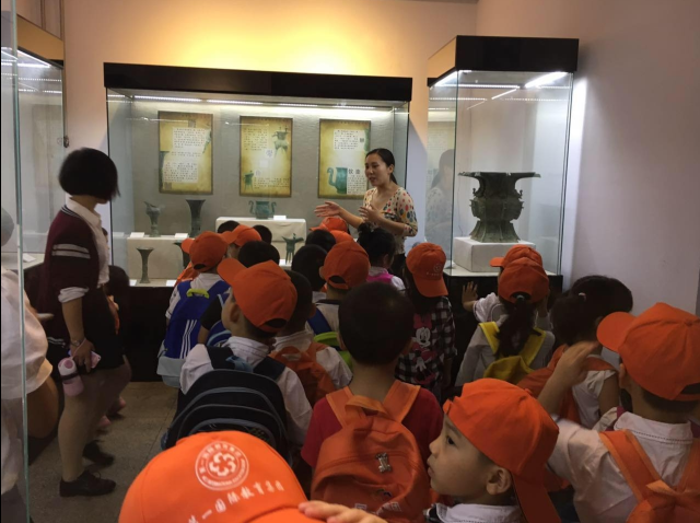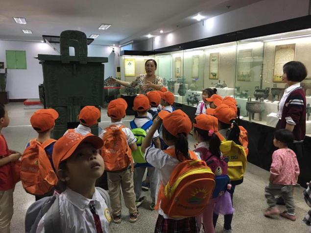 上午9点半,在孩子们欢快清脆的童声中,我们迎来了滨河国际幼儿园大班的全体师生。孩子在进入大楼的一瞬间便开始了止不住的惊呼和好奇,“老师,快看,这个是什么吖?好大,好漂亮啊”!有的孩子甚至开始脱队,忍不住好奇开始上前触摸放置在大厅的蝉纹鼎。