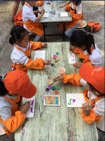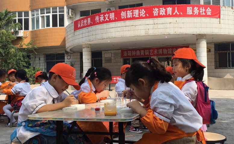 参观完博物馆,工作人员为每位小朋友发放精美的青铜器纹饰板,孩子们一排排的坐下所有人都认真的画出自己最美的色彩。